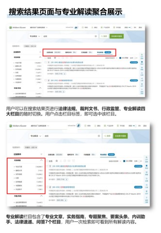 搜索结果页面与专业解读聚合展示 用户可以在搜索结果页进行法律法规、裁判文书、行政监管、专业解读四 大栏目的随时切换。用户点击栏目标签,即可选中该栏目。 专业解读栏目包含了专业文章,实务指南,专题聚焦、要案头条、内训助 手、法律速递、问答7个栏目,用户一次检索即可看到所有解读内容。