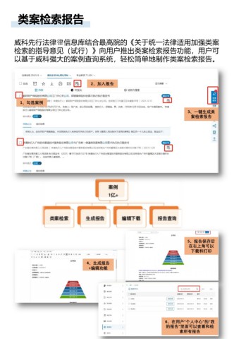 类案检索报告 威科先行法律律信息库结合最高院的《关于统一法律适用加强类案 检索的指导意见(试行)》向用户推出类案检索报告功能,用户可 以基于威科强大的案例查询系统,轻松简单地制作类案检索报告。 2、加入报告 1、勾选案例 3、一键生成类 案检索报告 5、报告保存后 在右上角可以 下载和打印 4、生成报告 +编辑功能 6、在用户“个人中心”的“我 的报告”里面可以查看和检 索所有报告