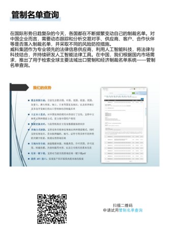 管制名单查询 在国际形势日趋复杂的今天,各国都在不断频繁变动自己的制裁名单。对 中国企业而言,需要动态跟踪和分析交易对手、供应商、客户、合作伙伴 等是否落入制裁名单,并采取不同的风险防控措施。 威科集团作为专业领先的法律信息供应商,利用人工智能科技,将法律与 科技结合,并持续研发人工智能法律工具。在中国,我们根据国内市场需 求,推出了用于检索全球主要法域出口管制和经济制裁名单系统——管制 名单查询。 扫描二维码 申请试用管制名单查询